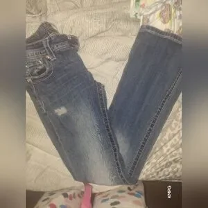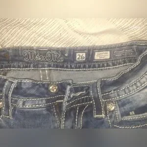 Stylish boot cut jeans by Miss Me. Features intricate silver detailing on pockets. Classic blue denim.