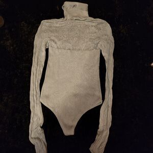 This fitted bodysuit from Free People features a stylish ribbed texture and a classic turtleneck collar, offering a sleek and modern look. The vibrant green color adds a pop of freshness to your wardrobe, making it a versatile piece for any occasion. Its bodysuit design ensures a seamless fit, perfect for layering or wearing on its own. I dont know the size. It measures pit to pit 12 inches but is very stretchy, so I think it could fit a lot of sizes!