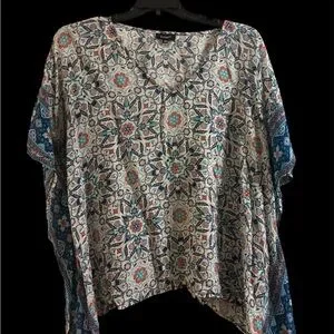 Chic floral blouse with a vibrant pattern. Features a V-neck and flowing sleeves. Ideal for casual outings.
