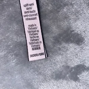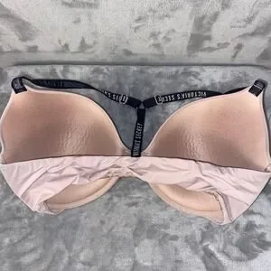 A gently used Victoria's Secret Uplift Demi Bra in size 36DDD. This bra features a front closure for easy wear and a unique T-back design with Victoria's Secret logo straps. The smooth cups offer a natural shape and comfortable support, making it ideal for everyday wear. The neutral beige or nude color ensures it remains discreet under various clothing styles.