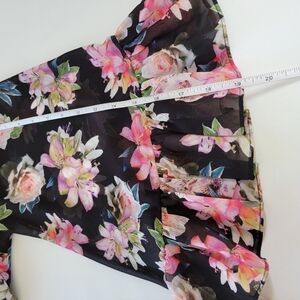 INC jewel neckline blouse. 100% sheer floral polyester. Measures flat 20" underarm seam to seam. Ruffled sleeve measures 19" from shoulder. 20.5" length. Size Medium