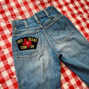 Vintage 70s Wrangler Jeans Flare Light Wash Western Blue Denim Cowboy Texas Navy Military Patch Raw Hem // Size 25