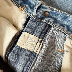 Tag reads size 27x34 but measurements are different. Zipper fly. Wear throughout like spots/rips etc.