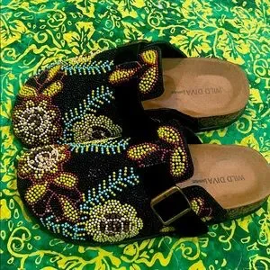 Vibrant beaded mules with floral patterns. Comfortable slip-on style. Perfect for a bold look. Never worn outside. From pet friendly but smoke free home.