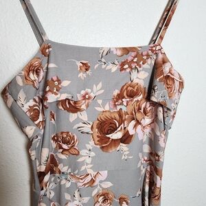 Pretty Charlotte Russe slip dress with a soft gray background and pink/brown floral print. Features adjustable spaghetti straps, ruffle overlay neckline, and a flowy silhouette. Lightweight and perfect for spring, summer, or layering with a jacket.