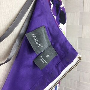 Vivid purple, violet, royal and light blue with dabs of grey and spring green floral pattern on white background - this dress has an empire waist