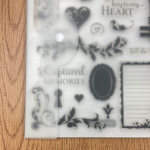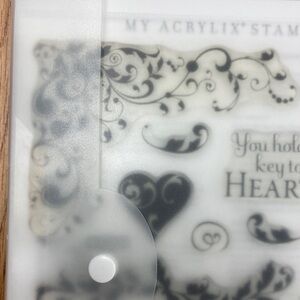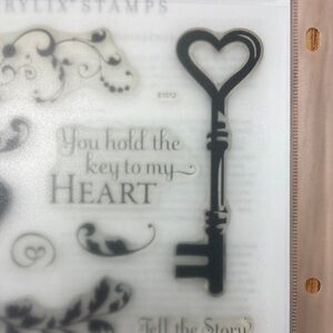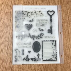 Enhance your crafts with this elegant acrylic stamps set featuring intricate black designs. Perfect for adding a personal touch to your projects. Stamped sayings include: “You hold the key to my HEART”, “Tell the Story”, “Captured MEMORIES”