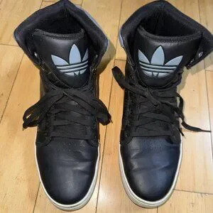 Adidas mens black with grey detail, leather, high top tennis shoes. Size 10. Like new. Only worn one time