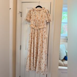 Elegant cream maxi dress with floral print. Features ruffled details and short sleeves. Perfect for any occasion.