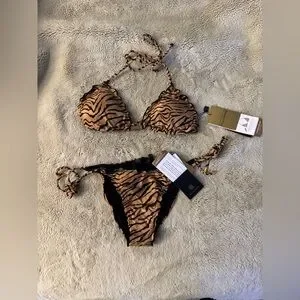 Triangle bikini top. Padded cups. Tiger-print. Stretch-polyamide. Fully lined. Ties at neck and back. Matching bikini brief.