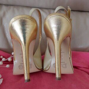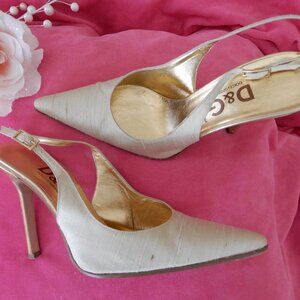 D&G Dolce & Gabbana Italy Cream Gold Silk Heels 37.5 US 7.5