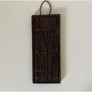 Evokes a sense of ancient artistry. This unique piece features two figures rendered in a distinctive folk-art style, appearing under some sort of canopy, all meticulously carved into a Ceramic panel. The rich, earthy tones and textured surface add depth and character, creating a visually captivating display. The back reveals it was crafted in Greece. It would be equally at home as a focal point in a living room, a unique addition to a gallery wall, or a thoughtful housewarming gift that brings a touch of global culture into any space.
