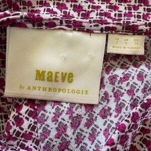 Maeve by Anthropologie halter top, women’s size 2. This stylish piece features a unique circular detail at the start of the halter neckline and a keyhole button closure at the back. The hem is softly rounded, and the fabric feels similar to a crepe/linen blend (exact material unknown as the care label has been removed). The top showcases a pink, burgundy, and cream geometric print with a lined design. Always gently cared for—washed on delicate and hung to dry. A chic and versatile piece for warm-weather wear.