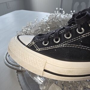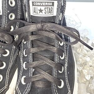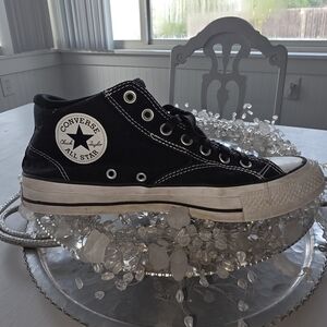 Converse Sneaker. Semi- high-tops. Black with white toe cap and stitching. Gently worn. Men's Size 9M. Offers welcomed.