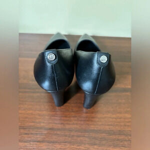 Timeless leather pumps by MK featuring a thick mid-rise heel and a pointed toe-box!