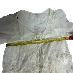 Features: Sheer mesh fabrication, contrast embroidered detail, low scoop-neckline with button closures, ruffled trim throughout, elasticated cuffs at sleeves, separate slip lining