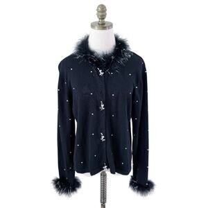 Vintage Y2K Black Cardigan w Feathers Women's Sz XL Button Up Rhinestone Accents