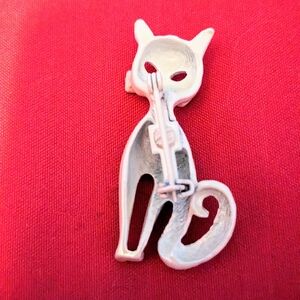 Charming silver cat brooch with orange accents, perfect for cat lovers. It's vintage and not in the best condition. It shows signs of vintage and I bought it that way 6 months ago.