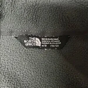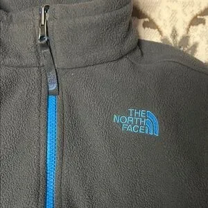 Size: M/M (10/12). The North Face jacket with a bold blue body and black sleeves. Features a full zip and high collar.