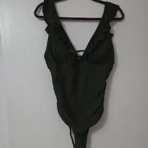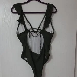 This stylish olive one-piece swimsuit features charming ruffles for a sophisticated look. Perfect for a day at the beach or pool.