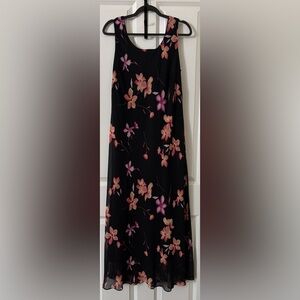 Fully lined black with flowers maxi dress. Features pink and yellow floral patterns. Ideal for stylish outings, casual or beech size 16