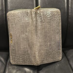 Elegant Miu Miu wallet. Croc-embossed design. Gold-tone logo and zipper.