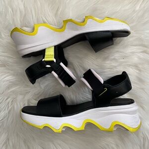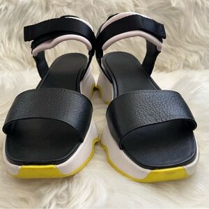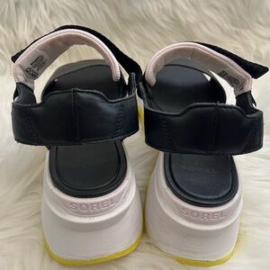 Sorel Kinetic Impact Y-Strap High Wedge Sandals Women's Sz 9.5 Green & Black. Pre-owned, light signs of wear on the inner straps and scuffs on the sides. Smoke free and pet friendly.