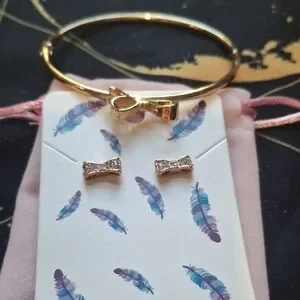 This elegant jewelry set features a gold bracelet and matching bow earrings. Perfect for adding a touch of sophistication to any outfit.