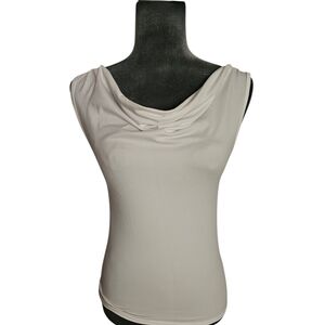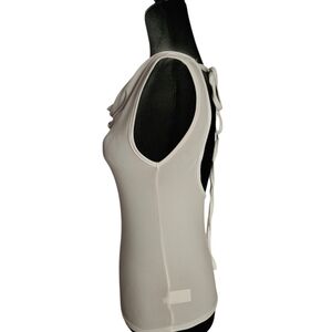 This chic white blouse is perfect for any occasion. Its elegant design and soft fabric ensure a comfortable and stylish fit. Ties at the neck. Sleeveless off the shoulder blouse. 95% Polyester 5% Elastine, Armpit to Armpit 15in Length 21in