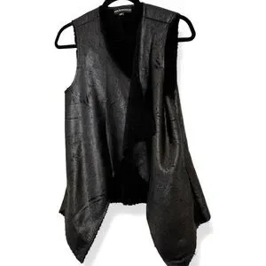 Edgy Rock & Republic women’s vest in black faux leather with a cozy sherpa-style lining. Features an open front drape design with an asymmetrical hem for a modern, layered look. Perfect for pairing over sweaters, long sleeves, or dresses for a chic statement piece.