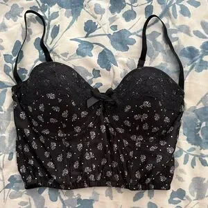 Chic black and white corset top with padded bra and adjustable straps. Features silky print and bow detail.