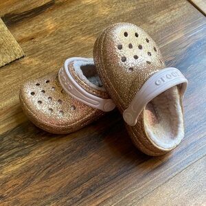 CROCS Glittery Gold Kids Slippers with pink fuzzy inside lining