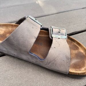 Classic Birkenstock sandals with two adjustable straps. Elegant slate blue/gray tone. Some staining. Good condition.