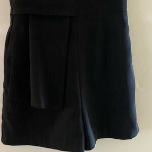 Chic black romper. Sleeveless design. Perfect for elegant occasions. Zipper down the back and tie in the front