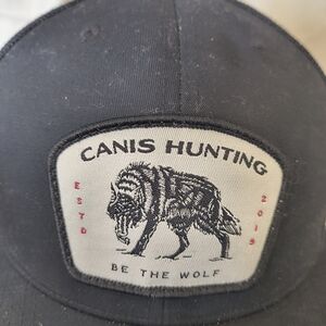 Stylish black trucker hat with Canis Hunting logo Be the wolf Est 2019. Features a wolf design on the front patch.