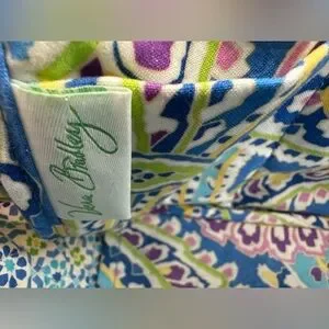 The Vera Bradley Bowler Bag in blue, green, and pink is a stylish and functional satchel/top handle bag with a colorful paisley pattern. This small bag features double handles in multicolor, a zip closure, and multiple pockets for organization. Made from cotton with a fabric lining, it is perfect for various occasions such as travel, weddings, parties, casual outings, workwear, and business events. The bag also includes a pouch accessory and is part of the popular Vera Bradley product line, known for its quality and unique designs.
