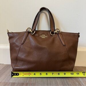 Coach satchel, Coach Kelsey small handbag, brown leather satchel, pebbled leather Coach bag, everyday handbag, gold hardware satchel, Coach purse authentic, classic Coach style.