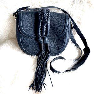 Altuzarra's gorgeous Ghianda Knot Saddle Bag in black pebbled leather is styled over the topline with a braided black leather strap tipped with long tassels. Ghianda, which means “acorn” in Italian, references the two finishing knots at the hand-braided bullrope detailing. Front flap style with magnetic closure. Polished gold tone hardware. Lined with beige canvas with both a slip pocket and zip pocket in the interior. Protective metal feet. With an adjustable flat leather strap (3 holes) that has a leather shoulder rest for comfort. New without tags. Original dust bag included.
