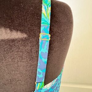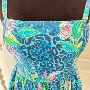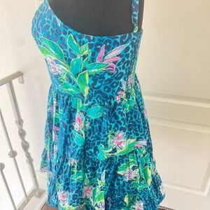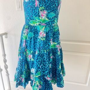 Lilly Pulitzer Sz 12 dress with bright blue, green and pink pattern. Sleeveless, fit and flare design with pockets and adjustable straps! Perfect for casual outings.