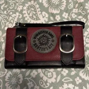 Calling all hunter! Stylish Supernatural red and black wristlet wallet with Winchester Bros design. Features buckle accents and wrist strap for on to go functionality. The strap is removable if you want to just use it as a wallet.