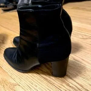 Stuart Weitzman short black size 7 leather boots with elastic back. 3” stack heels and a leather strip down the back.