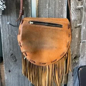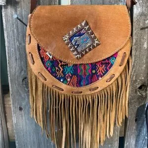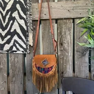 This is a boho-style suede crossbody bag featuring a natural tan-brown leather body with a long adjustable strap. The flap closure is decorated with a colorful woven textile patch in vibrant shades of red, blue, purple, and green, framed with hand-stitched detailing. The bottom edge of the bag is accented with long fringe tassels that give it a rustic, Western-inspired flair. The overall design blends Southwestern and bohemian elements, making it perfect for casual outfits, festivals, or everyday use.