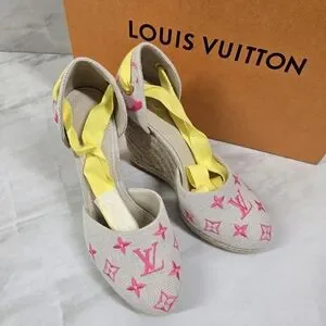 Step out in style with these Louis Vuitton espadrille wedges. Featuring a chic pink and yellow design, these shoes are perfect for adding a pop of color to any outfit. Enjoy the luxury and comfort of Louis Vuitton. Brand new in box with dust bags and extra laces!