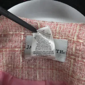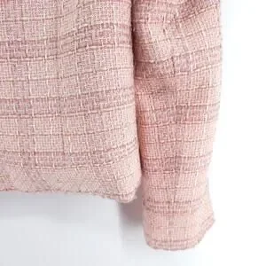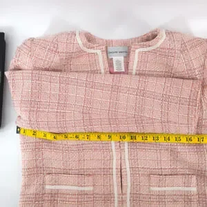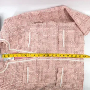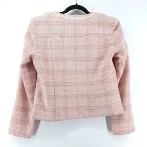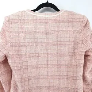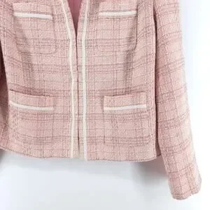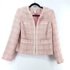 * Features: Vintage Women's Blazer Classic Fit Fully Lined. Pink and Ivory Tweed Plaid Design 4 Pockets on the front Cropped Sleeves ShortLength 3 Hook & Eye Clasps for Closure Contrasting Embroidery Detail
