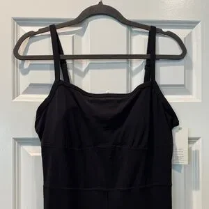 Sleek black jumpsuit with spaghetti straps. Perfect athletic wear, but also great for casual or dressy occasions paired with a cute jacket or sweater!