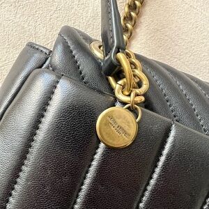 This stylish black quilted shoulder bag features a chic design with gold chain straps. Perfect for any occasion, it adds a touch of elegance to your outfit.
