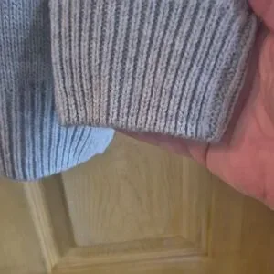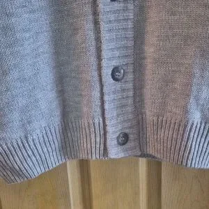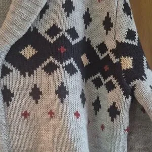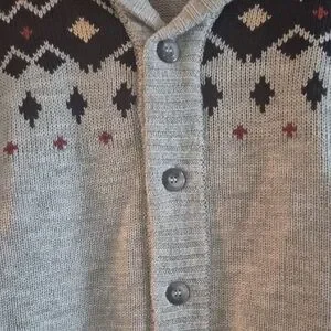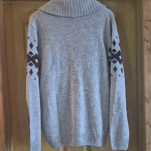 Cozy gray cardigan with black geometric patterns. Features a shawl collar and button front. Ideal for layering.