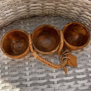 Keywords: Mud Pie, Triple Dip Server, Condiment Bowls, Wooden Bowls, Rope Handle, Serving Dish, Home Decor, Kitchenware, Entertaining, New, Rustic, Farmhouse, Wood