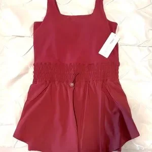 The prettiest brick red romper ever! Yogalicious Lux Stevie Hybrid Active Short Romper, women’s size small. Has elastic and adjustable cord at the waist, built in shorts with pockets, and built in bra with removable pads! New with tags.