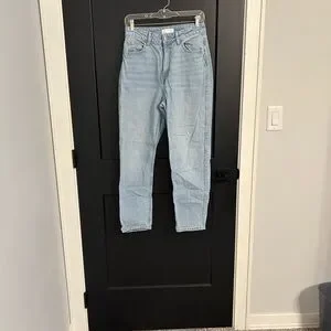 Classic straight leg jeans in a light wash. Perfect for everyday wear. Timeless and versatile style.